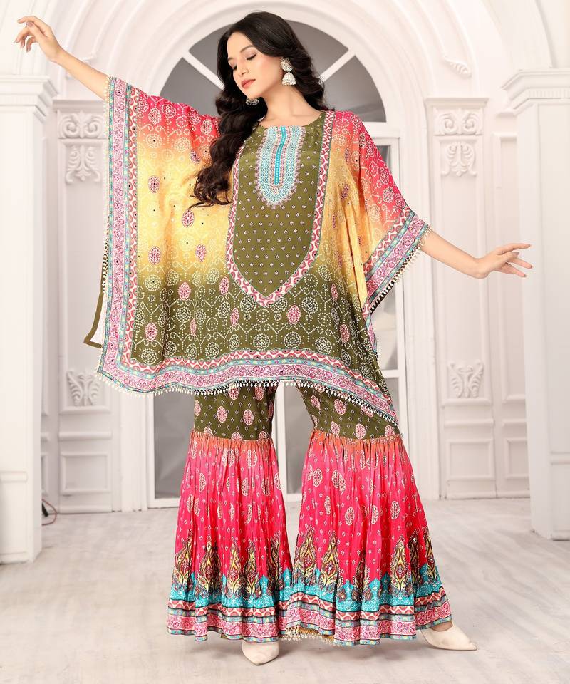 Multicolour Printed With Handwork Natural Crepe Kaftan With Sharara