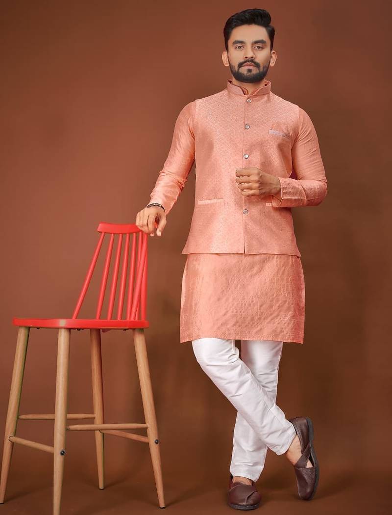 Peach Jecquard Silk Straight Kurta With Koti & Payjama