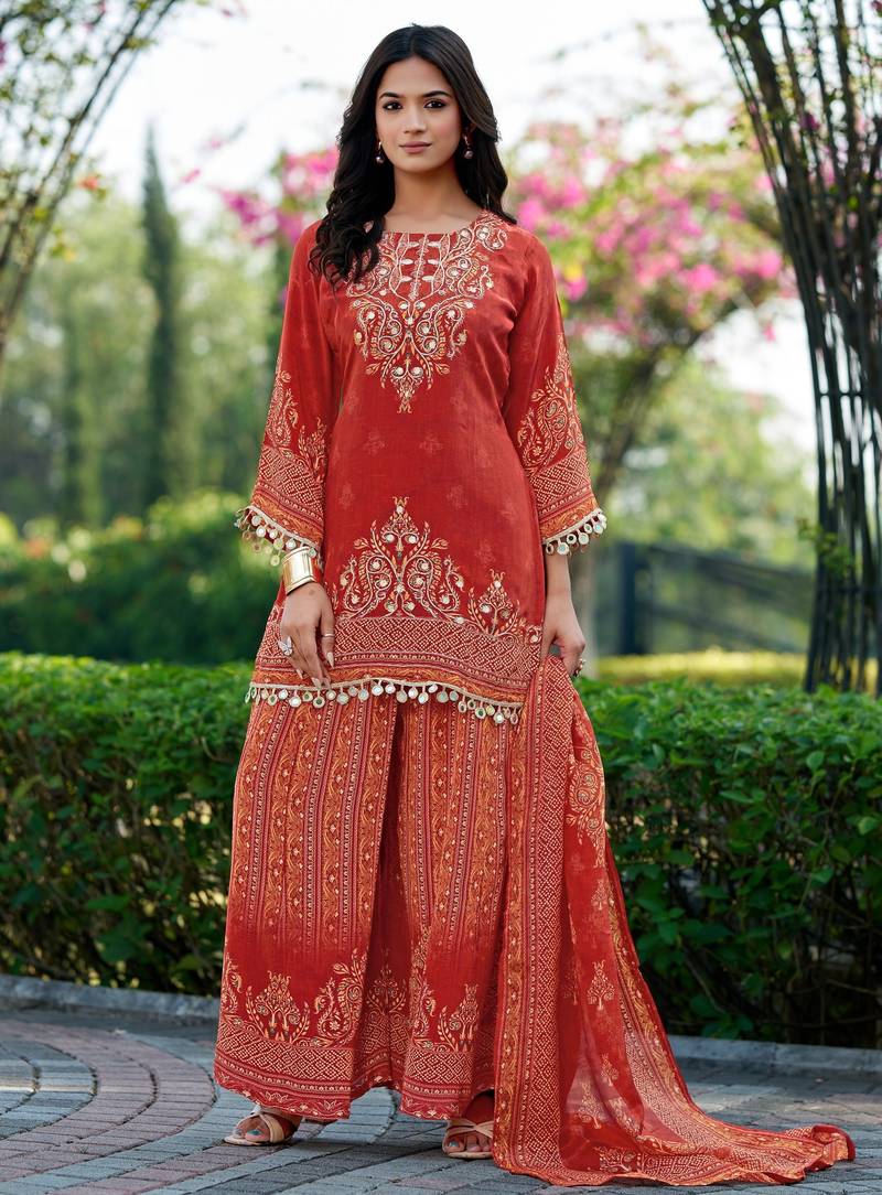 Rust Printed With Handwork Natural Crepe Ethnic Kurti Set With Plazzo