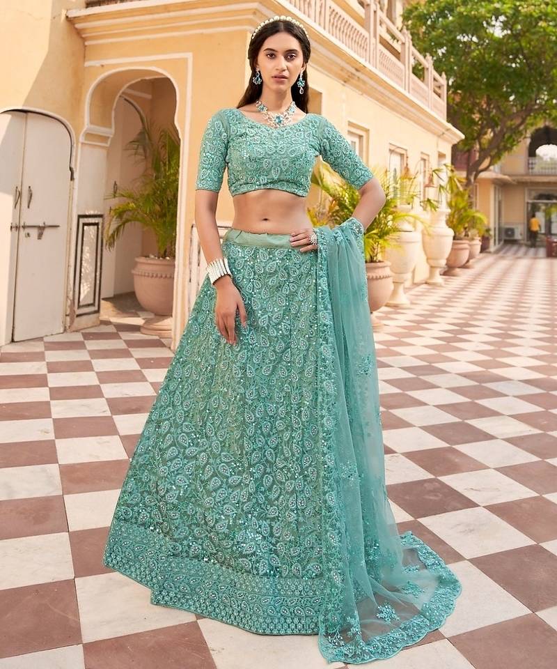 Turquoise Net Wedding Wear Lehenga Choli Set With Embroidery & Sequin Work