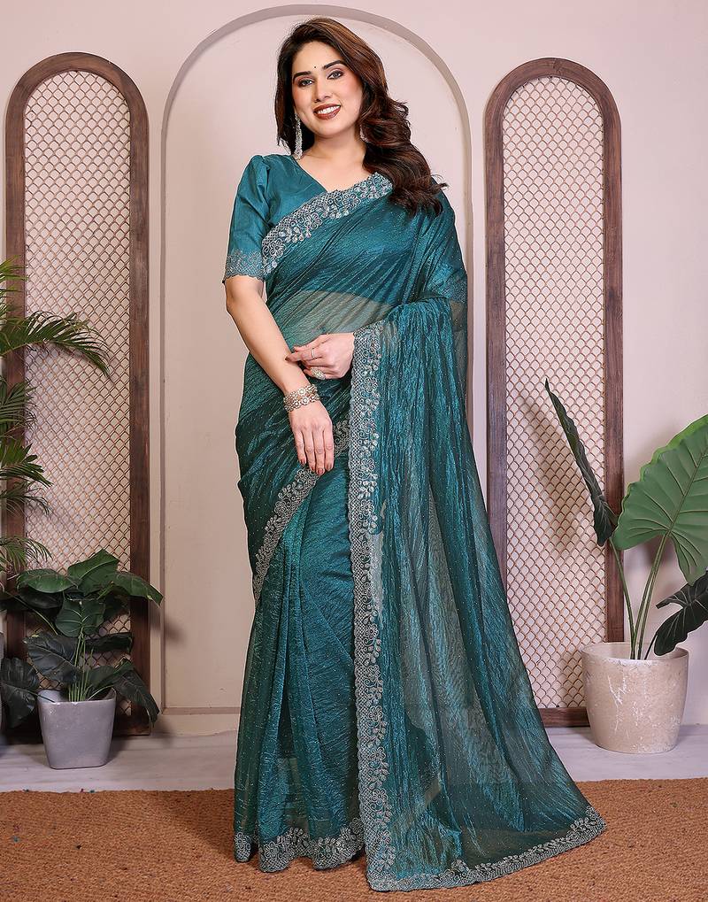 Add a touch of glamour to your ethnic collection with this stunning Net Embellished Saree. Crafted from lightweight net fabric, it features intricate embellishments that create a rich and sparkling look. The elegant diamond lace border enhances its luxurious appeal. Paired with a matching blouse piece, this saree is perfect for weddings, parties, receptions, and festive occasions, offering graceful drape with eye-catching charm.