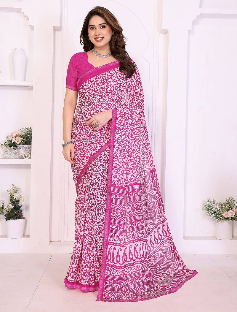 Pink Floral Georgette Saree With Lace Border & Blouse Piece