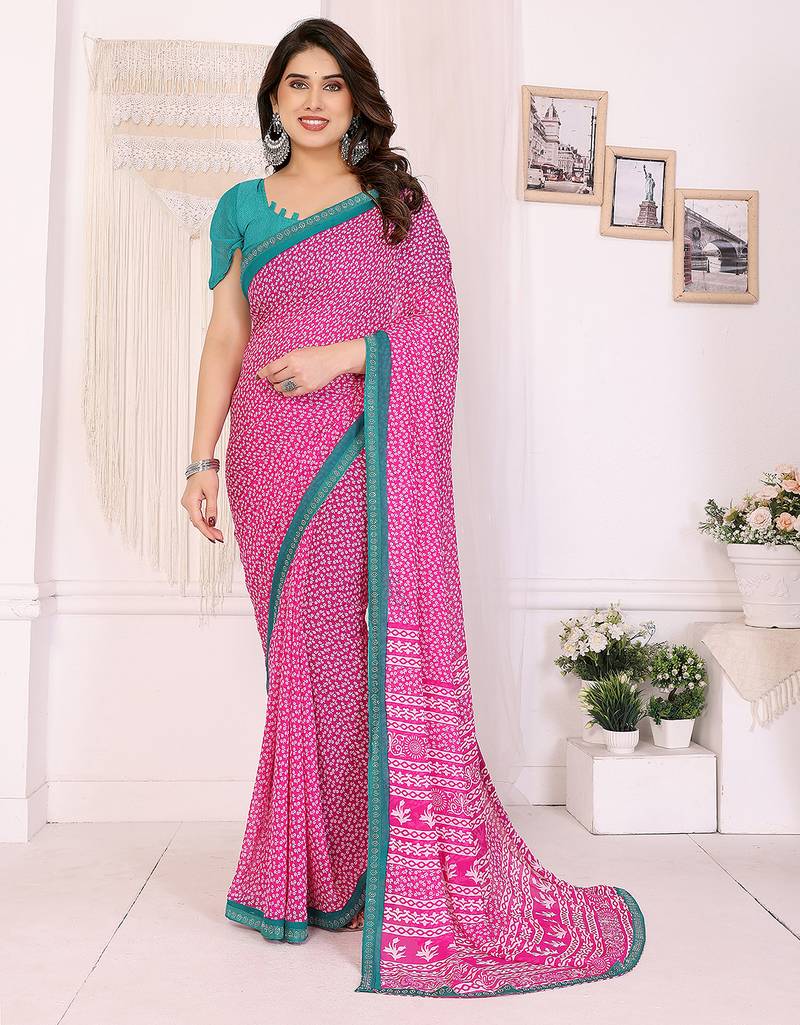 Pink Floral Georgette Saree With Lace Border & Blouse Piece