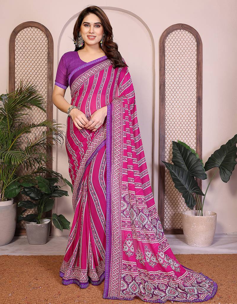 Pink Floral Georgette Saree With Lace Border & Blouse Piece