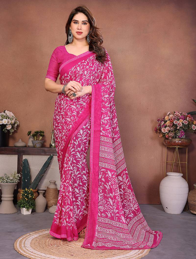 • Saree : Color- Pink / Fabric- Georgette • Blouse : Color- Pink / Fabric- Georgette Saree Details