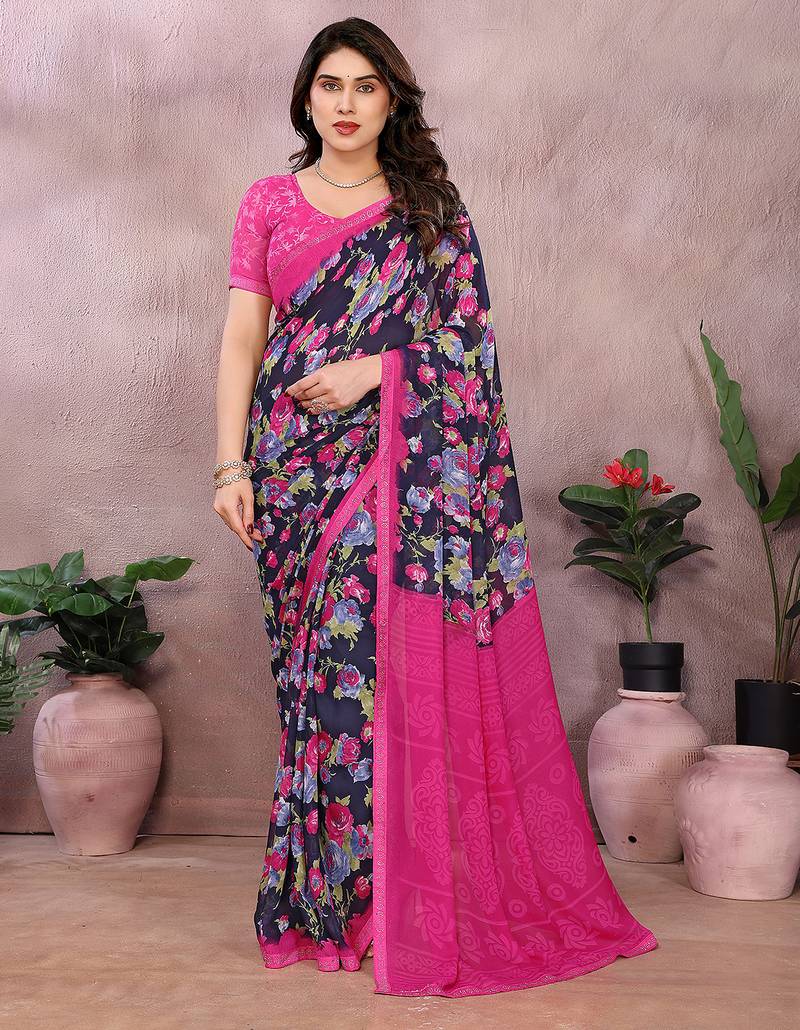 Pink Floral Georgette Saree With Lace Border & Blouse Piece