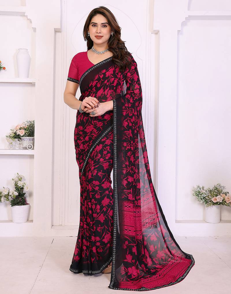 Pink Floral Georgette Saree With Lace Border & Blouse Piece