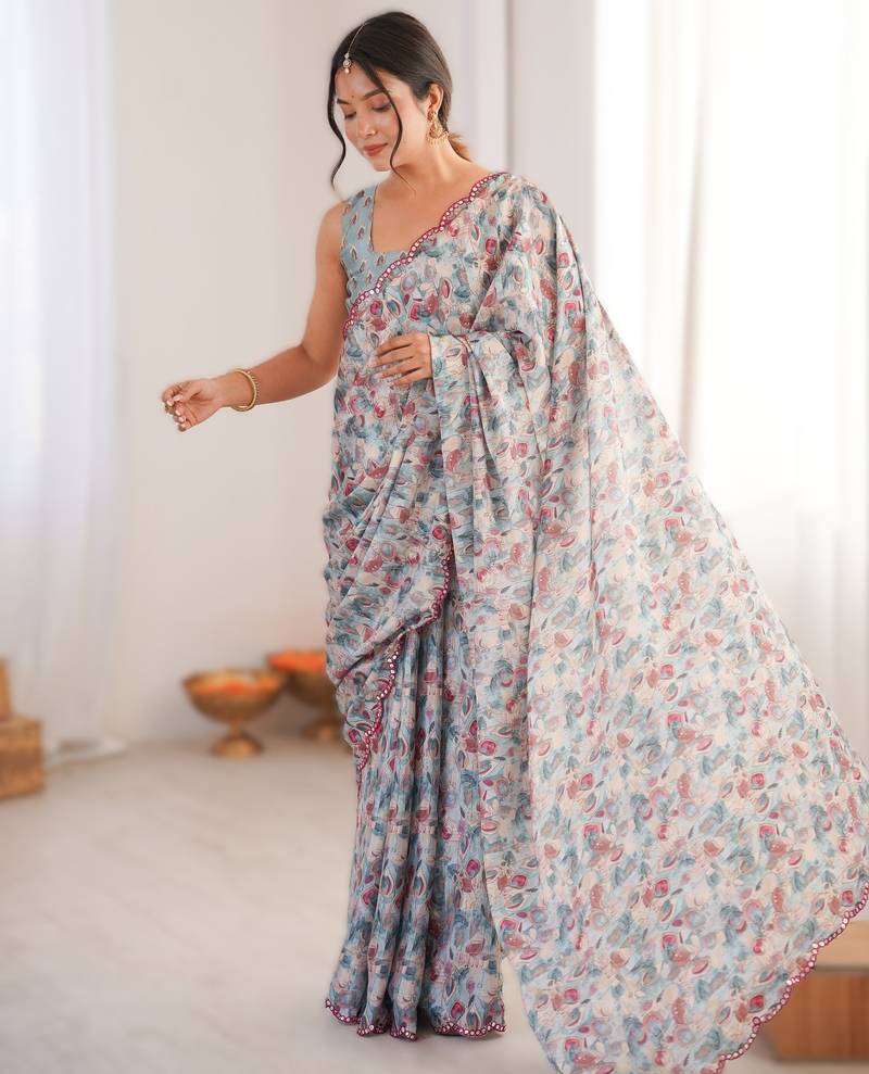 Blue Heavy Chinon Printed Saree With Mirror Work Border