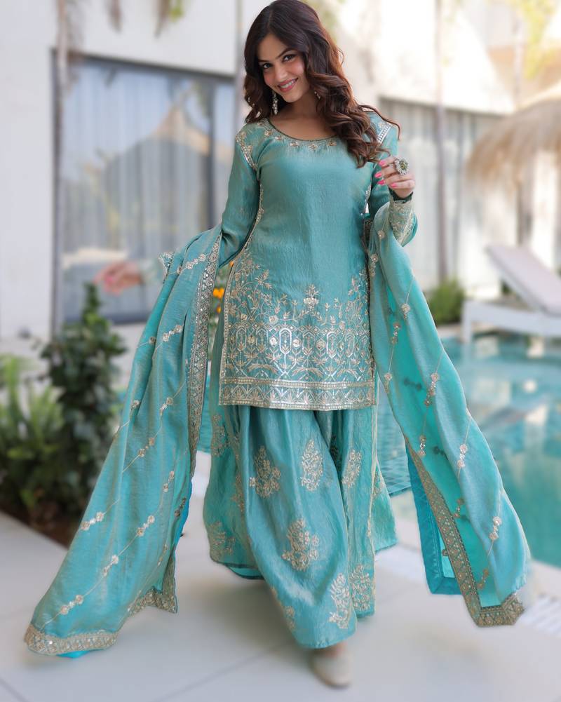 Blue Designer Ready Made Top Sharara Dupatta Set Stitched