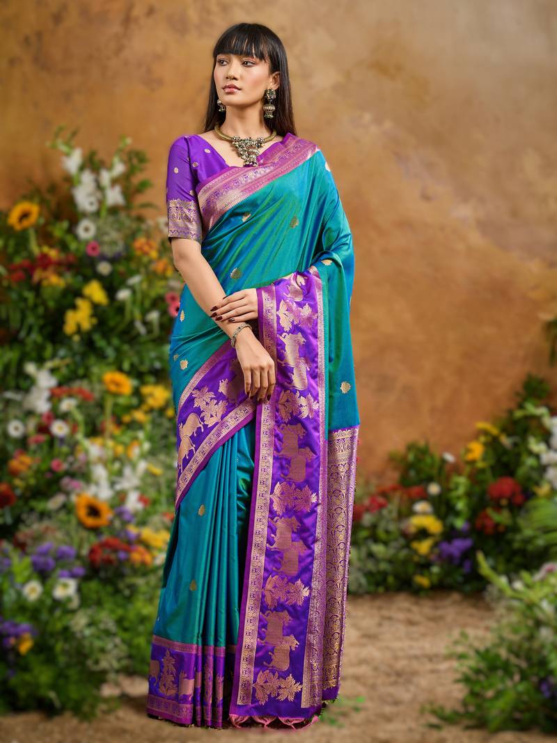 • Saree : Color- Blue / Fabric- Pure Silk • Blouse : Color- Purple / Fabric- Pure Silk Saree Details