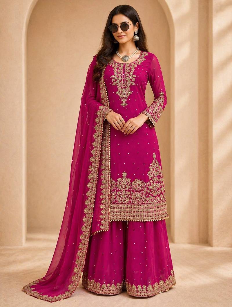 • Product Id : 4757900 • Package Details : 1 Top/1 Dupatta/1 Bottom • Type : Readymade Suits For Women • Region : All • Work : Embroidered • Sleeve : Full Sleeve • Neck Style : U Neck • Color : Rani Pink • Fabric : Faux Georgette • Stitching : Stitched General - Color and Texture may have slight variation. This happens because of photography.