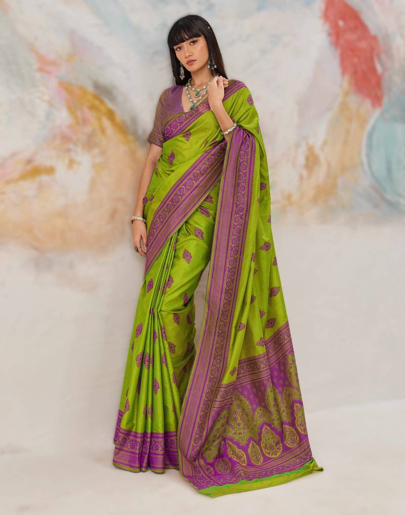 • Saree : Color- Parrot Green / Fabric- Silk Blend • Blouse : Color- Lavender / Fabric- Silk Blend Saree Details