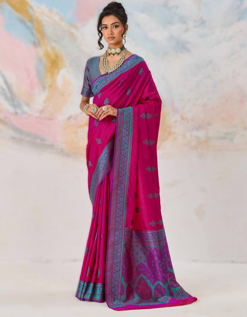 • Saree : Color- Pink / Fabric- Silk Blend • Blouse : Color- Slate Grey / Fabric- Silk Blend Saree Details