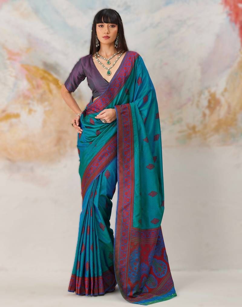 • Saree : Color- Sky Blue / Fabric- Silk Blend • Blouse : Color- Purple / Fabric- Silk Blend Saree Details