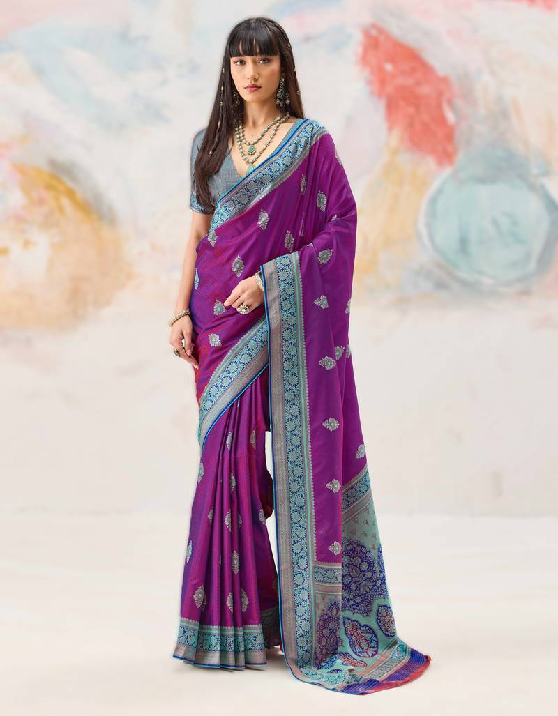 • Saree : Color- Wine / Fabric- Silk Blend • Blouse : Color- Blue / Fabric- Silk Blend Saree Details