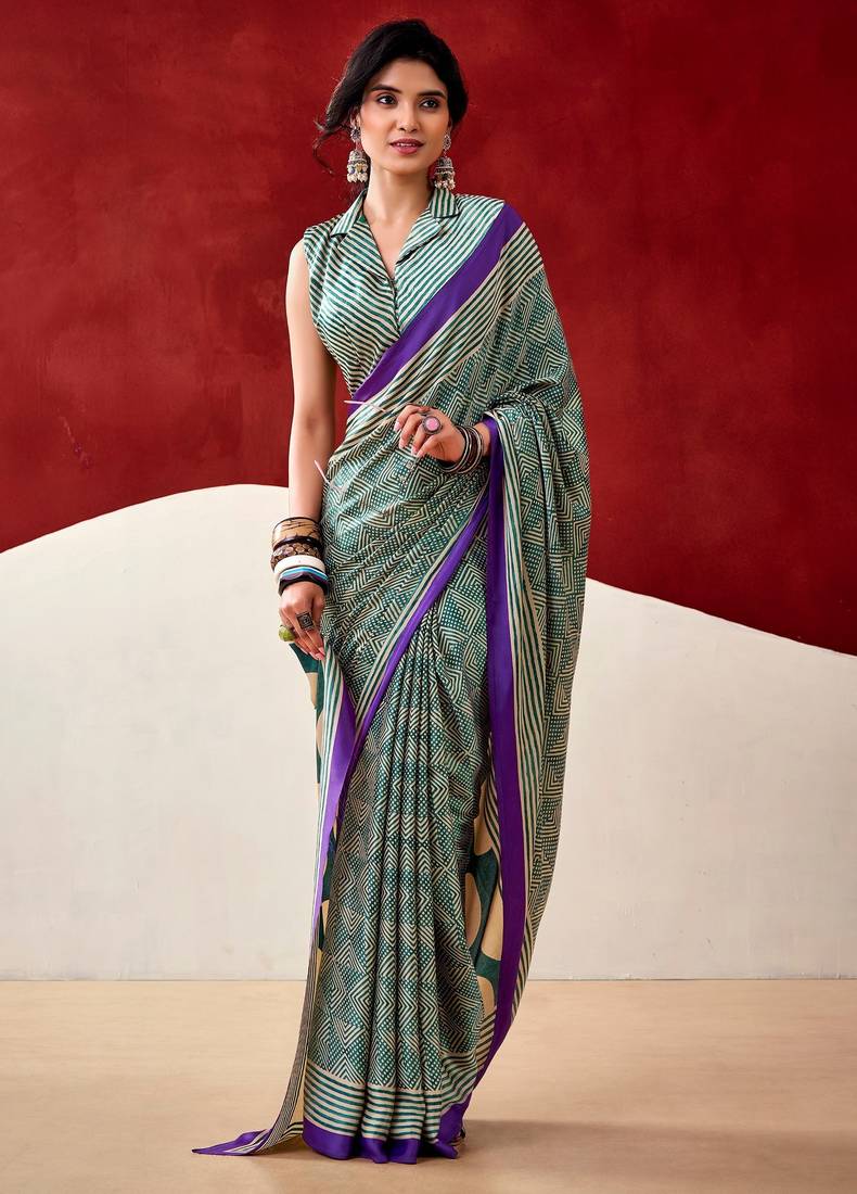 Green Fancy Printed Dull Satin Saree With Matching Blouse