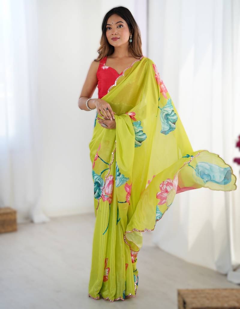 Green Heavy Chinon Printed Saree With Pape Mirror Work & Mirror Border | Designer Party & Wedding Wear Saree