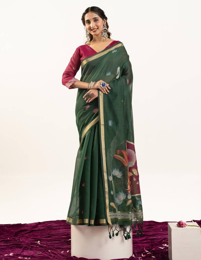 Green Premium Muga Cotton Saree With Rajwadi Weaving, Lotus Buttis & Contrast Blouse