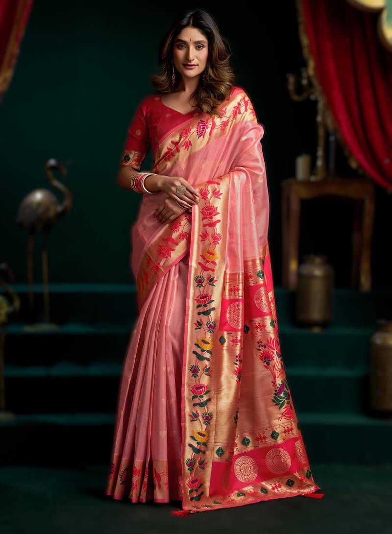 Light Pink Premium Tissue Paithani Saree With Lotus Zari Border & Pum Pum
