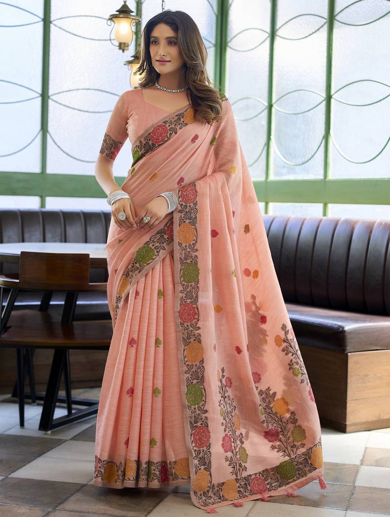 • Saree : Color- Peach / Fabric- Linen • Blouse : Color- Peach / Fabric- Linen Saree Details