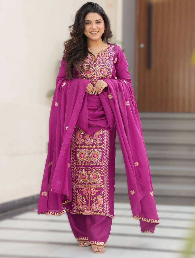 Magenta Readymade Chinnon Silk Embroidered Kurta Pant Dupatta Set Stitched