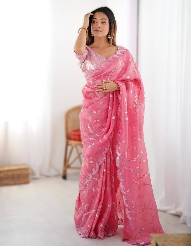 Pink Gold Crush Thread & Sequence Work Saree With Blouse