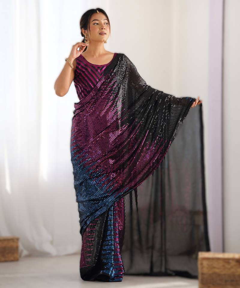 Pink Premium Celebrity Inspired Multicolor Sequins Georgette Saree With Embroidered Satin Banglori Blouse