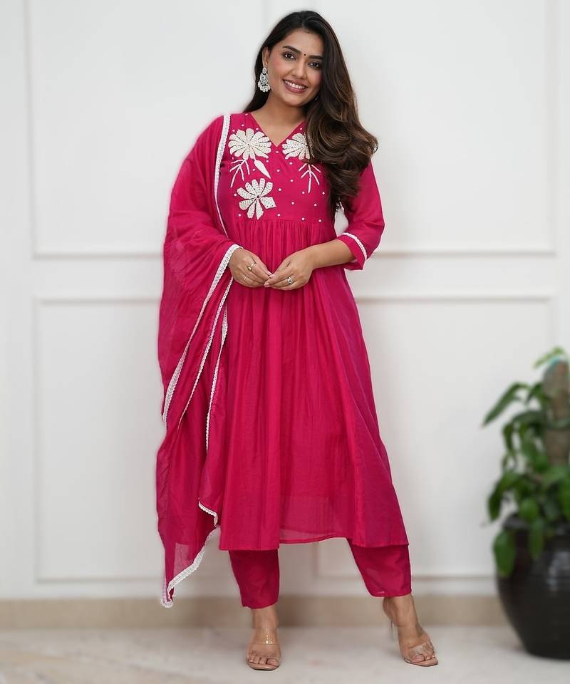 • Product Id : 4702919 • Package Details : 1 Top/1 Bottom/1 Dupatta • Type : Readymade Suits For Women • Region : All • Occasion : Casual • Work : Embroidered • Sleeve : Full Sleeve • Neck Style : V Neck • Color : Pink • Fabric : Silk Blend • Stitching : Stitched Payments [+]