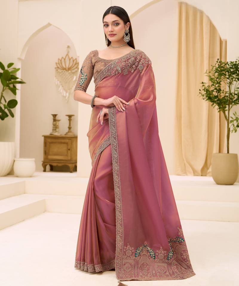 Description: Pretty pink tissue georgette saree with subtle shine and graceful drape, paired with brocade zari blouse.