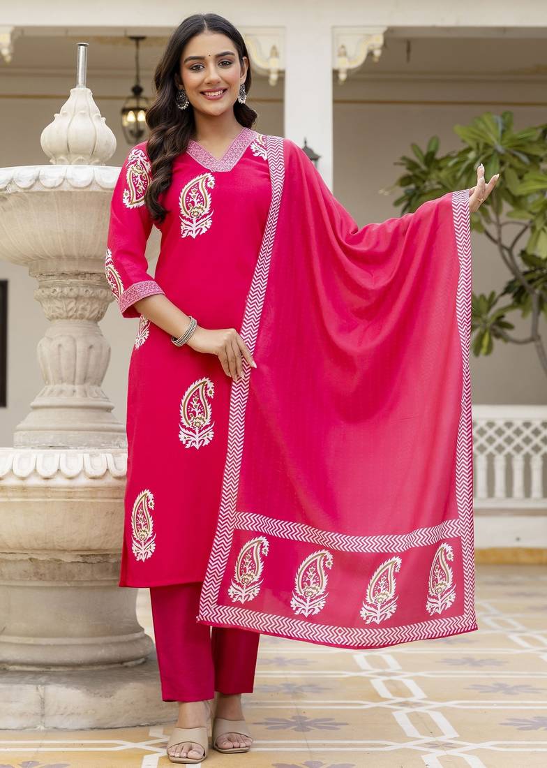 • Product Id : 4716644 • Package Details : 1 Top/1 Bottom/1 Dupatta • Type : Readymade Suits For Women • Region : All • Occasion : Casual • Work : Printed • Sleeve : Full Sleeve • Neck Style : V Neck • Fabric : Rayon • Color : Pink • Stitching : Stitched Payments [+]