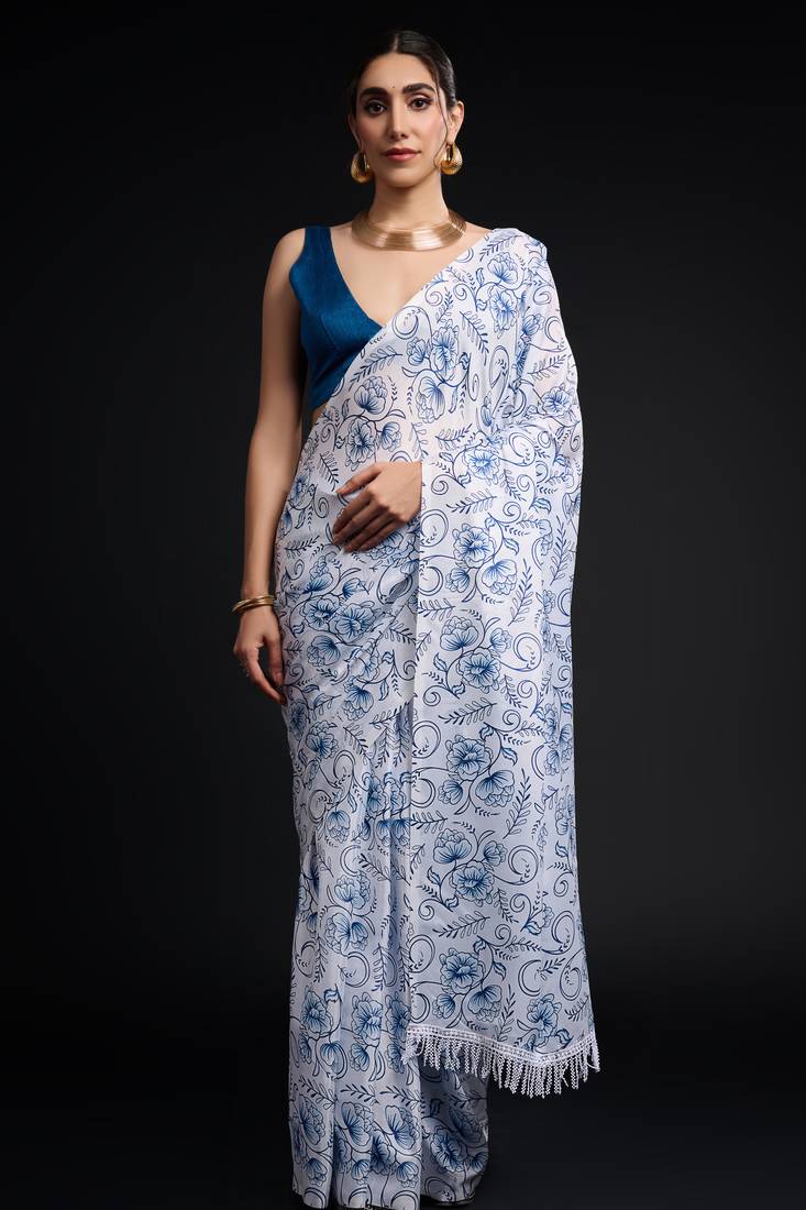 • Saree : Color- White / Fabric- Art Silk • Blouse : Color- Blue / Fabric- Art Silk Saree Details