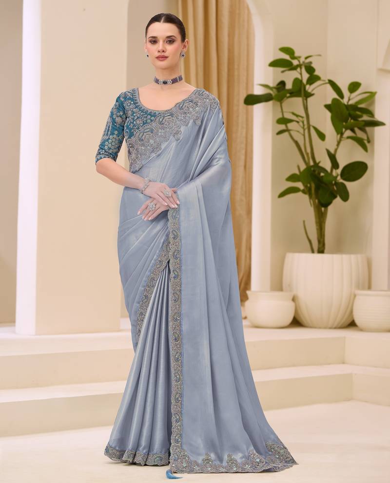 Description: Elegant silver shimmer satin saree with a glossy finish and modern appeal. Includes Banglori work blouse.