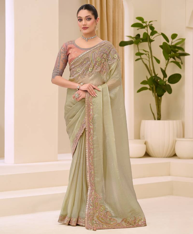 Description: Premium sunsilk tissue saree with a glossy finish and rich appeal. Comes with brocade zari work blouse, perfect for grand occasions.