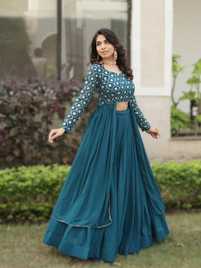 • Fabric : Georgette • Color : Teal • Work : Embroidery • Available : Yes • Size : 100 Cm • Fabric : Georgette • As Per Image : Yes Other Details