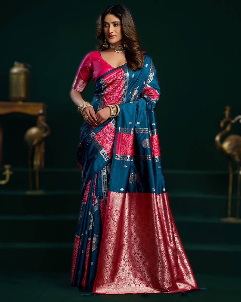 • Saree : Color- Teal / Fabric- Art Silk • Blouse : Color- Rani Pink / Fabric- Art Silk Saree Details