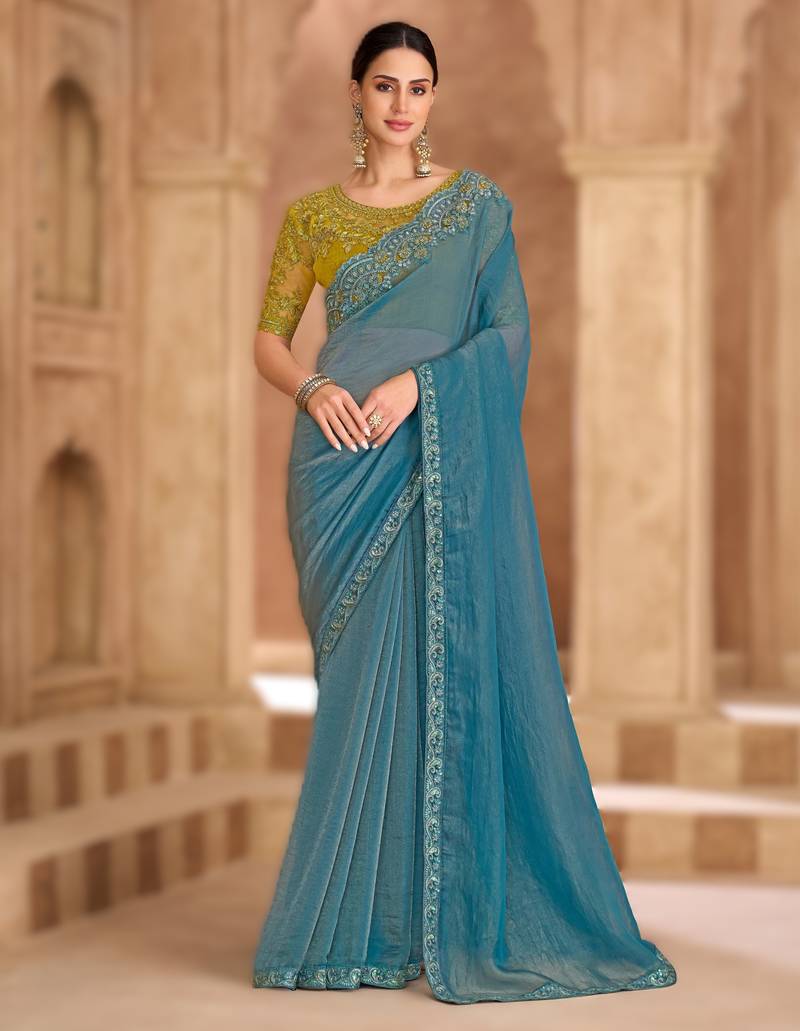 • Saree : Color- Sky Blue / Fabric- Georgette • Blouse : Color- Green / Fabric- Georgette Saree Details