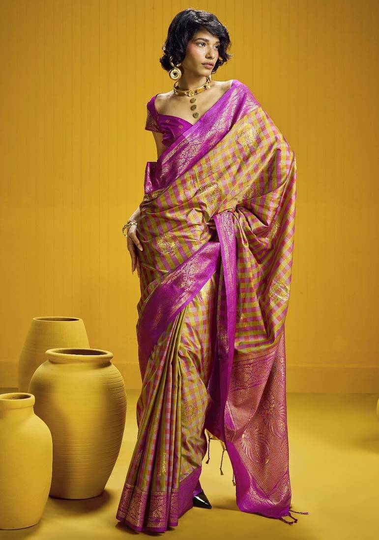 Traditional Handloom Pure Silk Saree With Checks Pattern & Matching Blouse