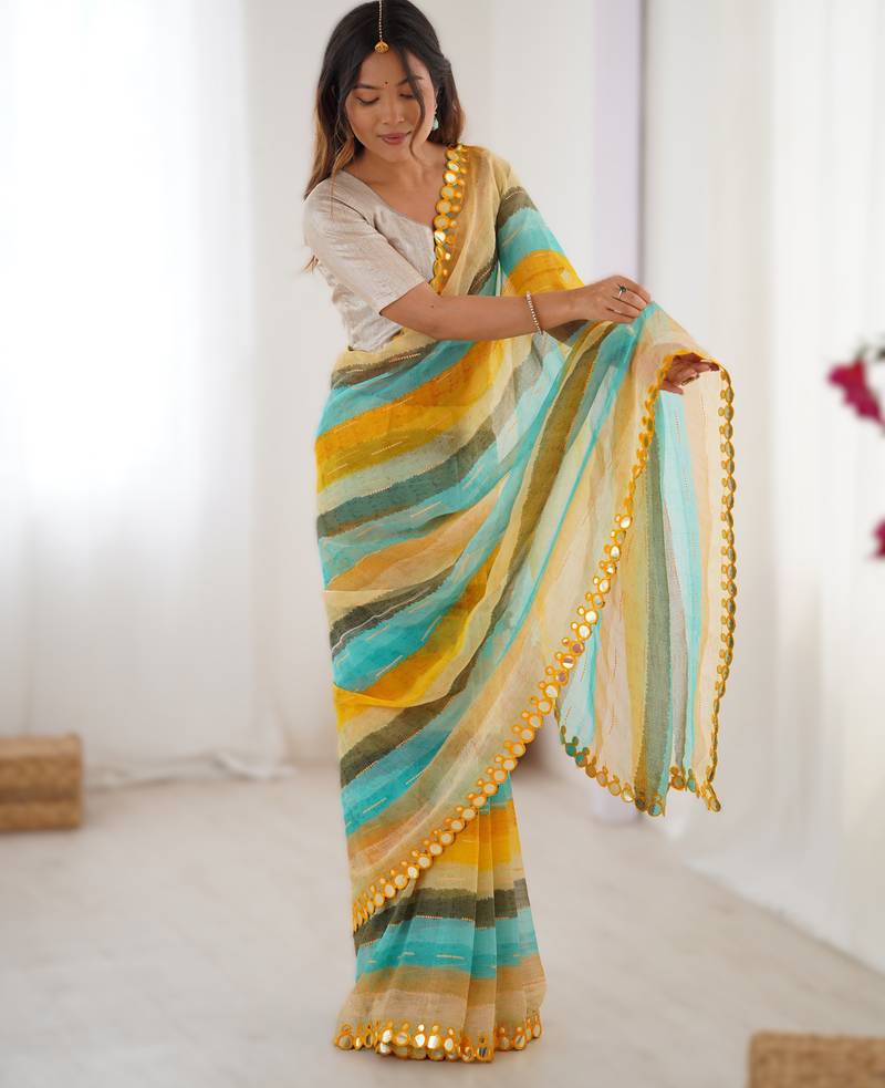 Yellow Heavy Smooth Marble Chiffon Leriya Print Saree With Zari Work & Double Line Paper Mirror Border