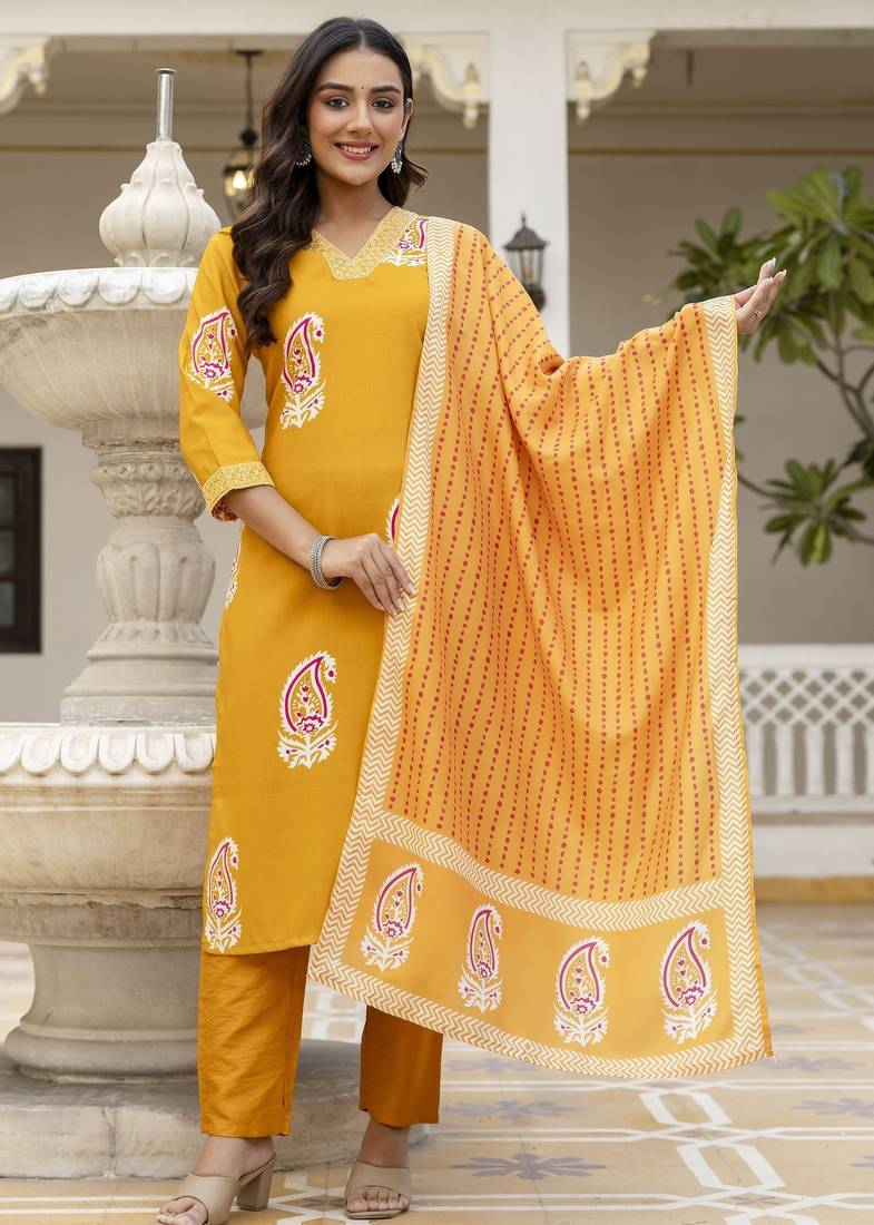 • Product Id : 4716647 • Package Details : 1 Top/1 Bottom/1 Dupatta • Type : Readymade Suits For Women • Region : All • Occasion : Casual • Work : Printed • Sleeve : Full Sleeve • Neck Style : V Neck • Fabric : Rayon • Color : Yellow • Stitching : Stitched Payments [+]