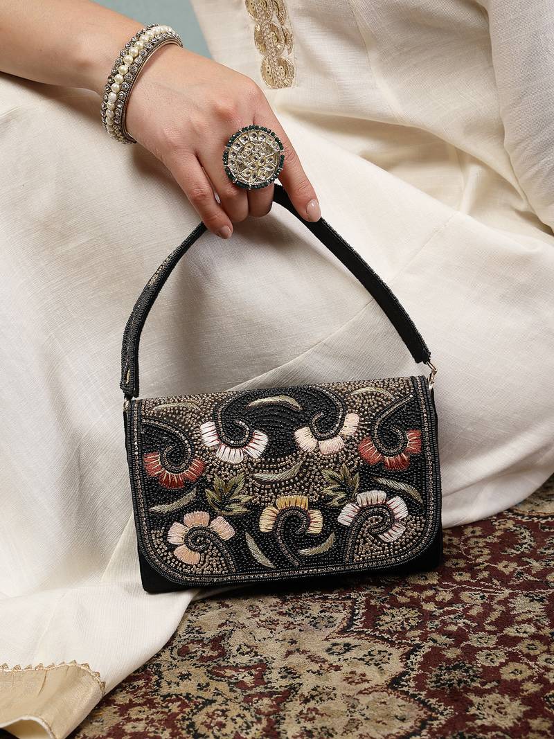 The Anekaant Clutch from the Beaded Botanica Collection is designed with a single interior compartment secured by a refined button closure, offering elegant and practical storage. Finished in a classic black base, the design is elevated with multicolor embroidery that adds a striking yet sophisticated touch. Crafted from premium suede and finished with a matching suede lining, the clutch delivers a rich, cohesive look and feel. The exterior features a floral swirl design, enriched with intricate beadwork and metallic thread highlights for added depth and visual interest. Designed with an inner slip pocket for essentials and a detachable handle, this clutch is perfect for evening parties and special occasions. Dimensions (L × H × W): 20 × 13 × 5.5 cm.