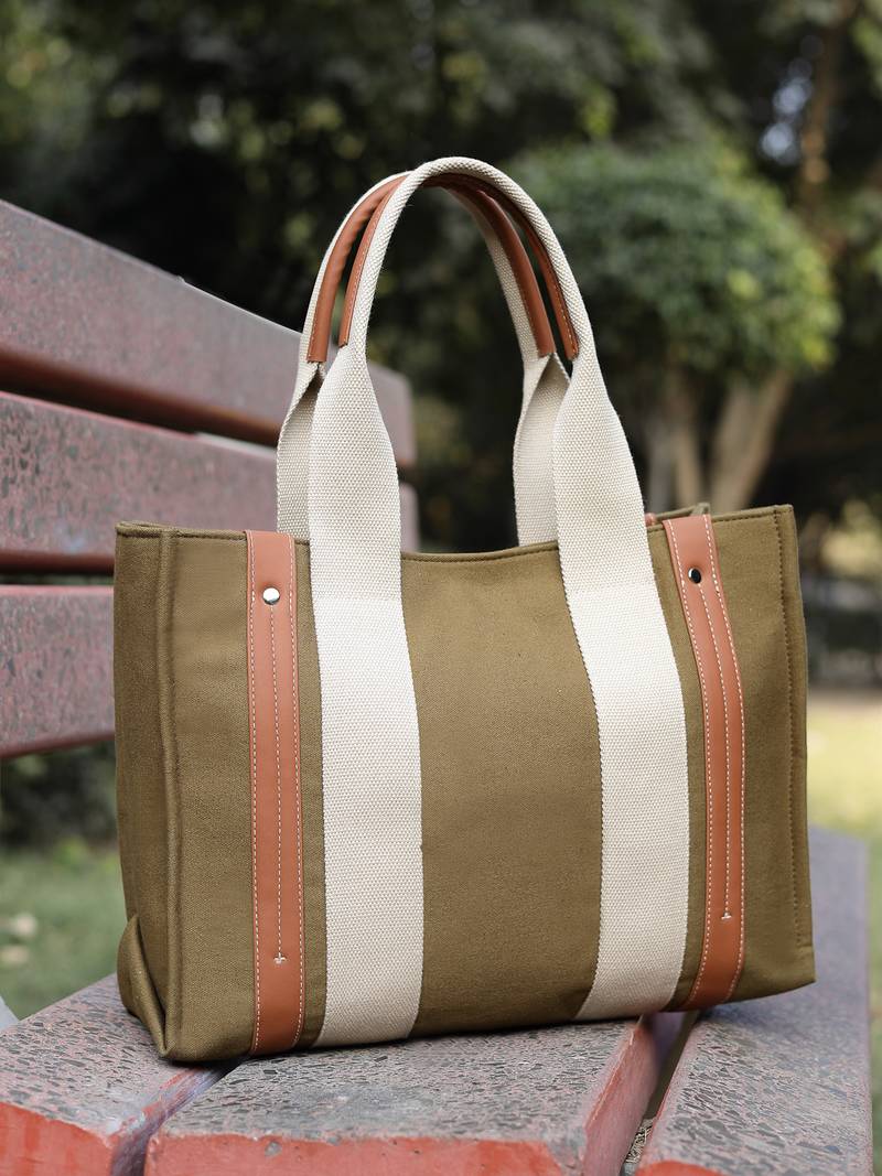 This Anekaant Handheld Bag from the Sutra Soil collection is thoughtfully designed with a single main compartment secured by a magnetic button closure, offering ease of access with a structured finish. Crafted in a muted olive green canvas, enhanced with beige handles and tan faux leather highlights, the bag delivers a grounded, earthy appeal. The color-blocked design is enhanced with statement straps and refined leather detailing, adding depth and character to its silhouette. Made from sturdy cotton canvas with Vegan Leather detailing and finished with a smooth polyester lining, the bag balances durability with everyday elegance. Functional features include two comfortable carry handles, an inner zip pocket for valuables, and two inner slip pockets to keep daily essentials neatly organized. Dimensions (L × H × W): 36 × 26 × 11 cm