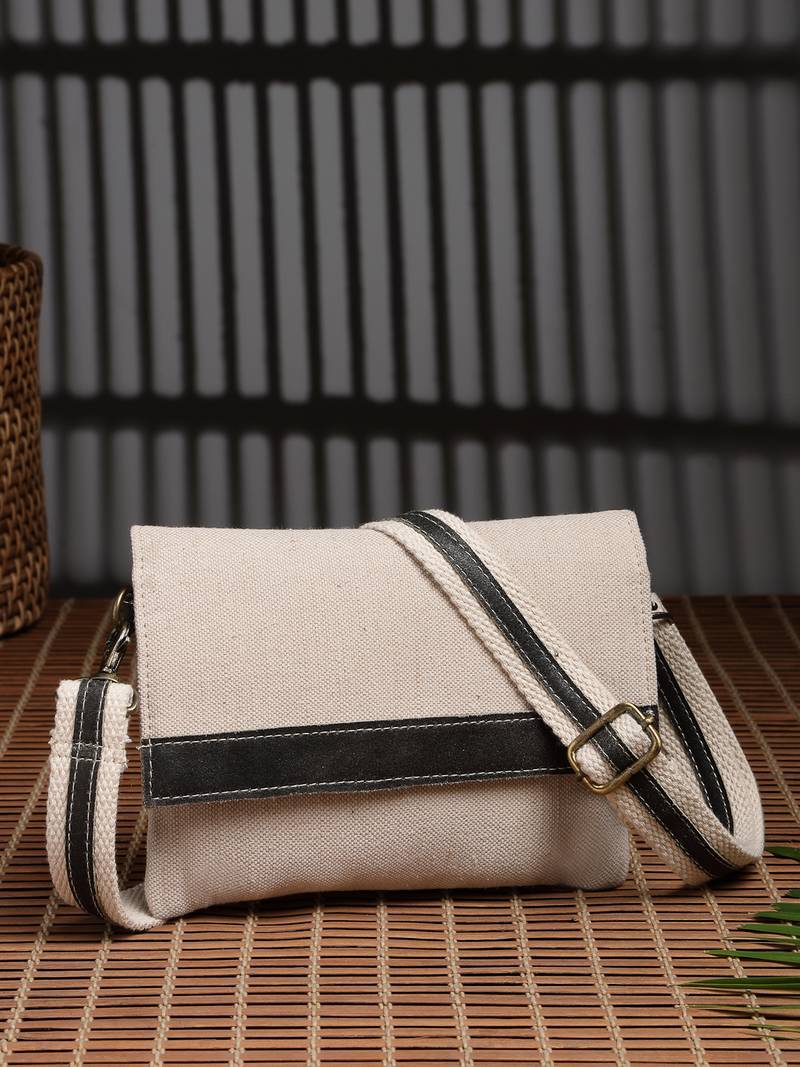 This Anekaant Sling Bag from the Timber & Thread collection is thoughtfully designed with a single main compartment secured by a magnetic button closure, offering effortless access while keeping essentials safe. Crafted in an off-white body, it is elevated with contrasting Olive accents on the flap and handle details, creating a sharp and modern contrast. The solid textured canvas surface is enhanced with clean lines and precise contrast stitching, adding subtle structure to the design. Made from a refined combination of crackle leather and jute cotton, the bag is finished with a durable polyester lining for everyday reliability. Functional features include an inner slip pocket for essentials, an outer back zip pocket for quick access, and an adjustable, detachable strap for versatile wear. Dimensions (L × H × W): 20 × 15 × 2 cm