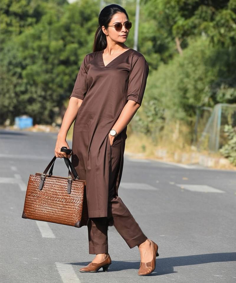 Elevate your ethnic wardrobe with this sophisticated brown kurta set that combines style and comfort effortlessly. The ensemble features a beautifully designed V-neck kurta with 3/4 sleeves, crafted from smooth rayon fabric that ensures comfort throughout the day. The straight-cut silhouette offers a contemporary look while maintaining traditional charm. Paired with matching palazzo pants, this set creates a balanced and graceful appearance perfect for both casual and semi-formal occasions. The rich brown colour makes it versatile for various styling options, while practical features like the comfortable fit and durable construction make it a wardrobe essential. The kurta's length and cut provide elegant draping, while the palazzo pants offer ease of movement. This set is ideal for festive celebrations, office wear, or social gatherings where you want to make a refined style statement.