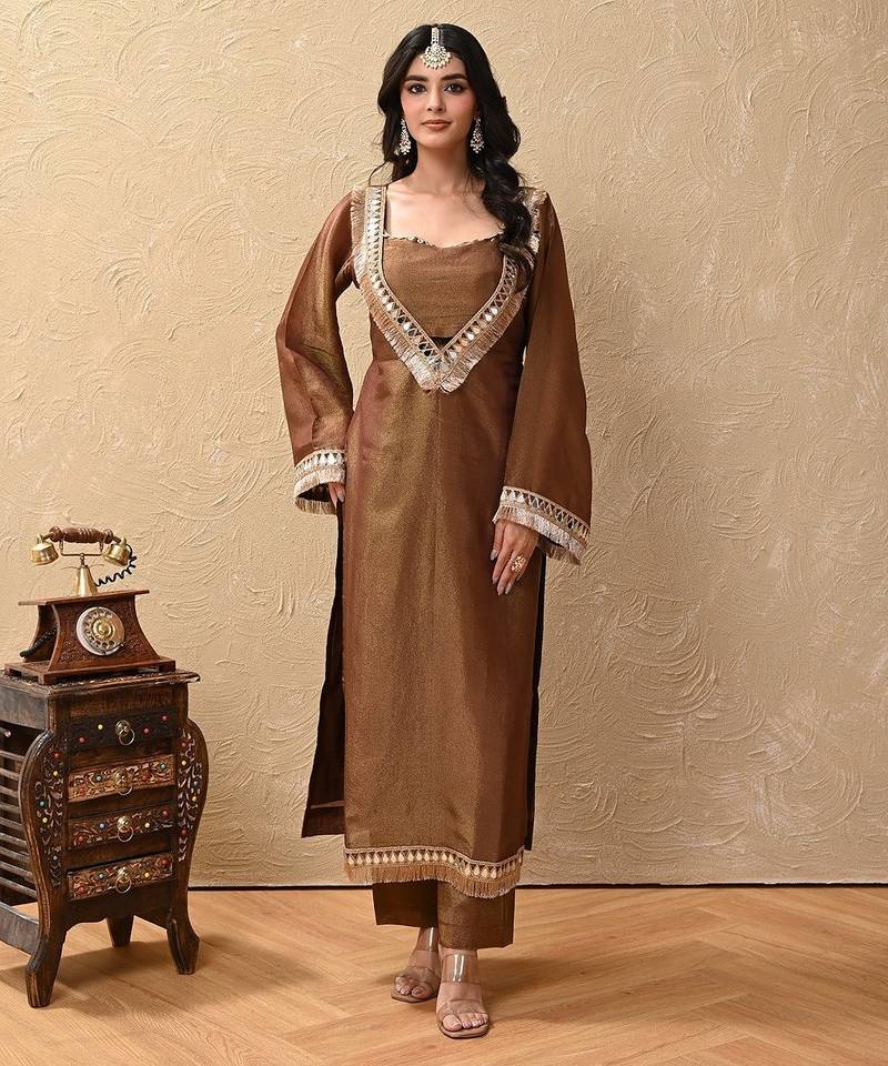 • Product Id : 4675188 • Package Details : 1 Kurta/1 Inner/1 Pant • Type : Plus Size Kurtis • Fabric : Tissue • Sleeve : Full Sleeve • Color : Brown • Work : Mirror • Stitching : Stitched • Length : 42.0 Payments [+]