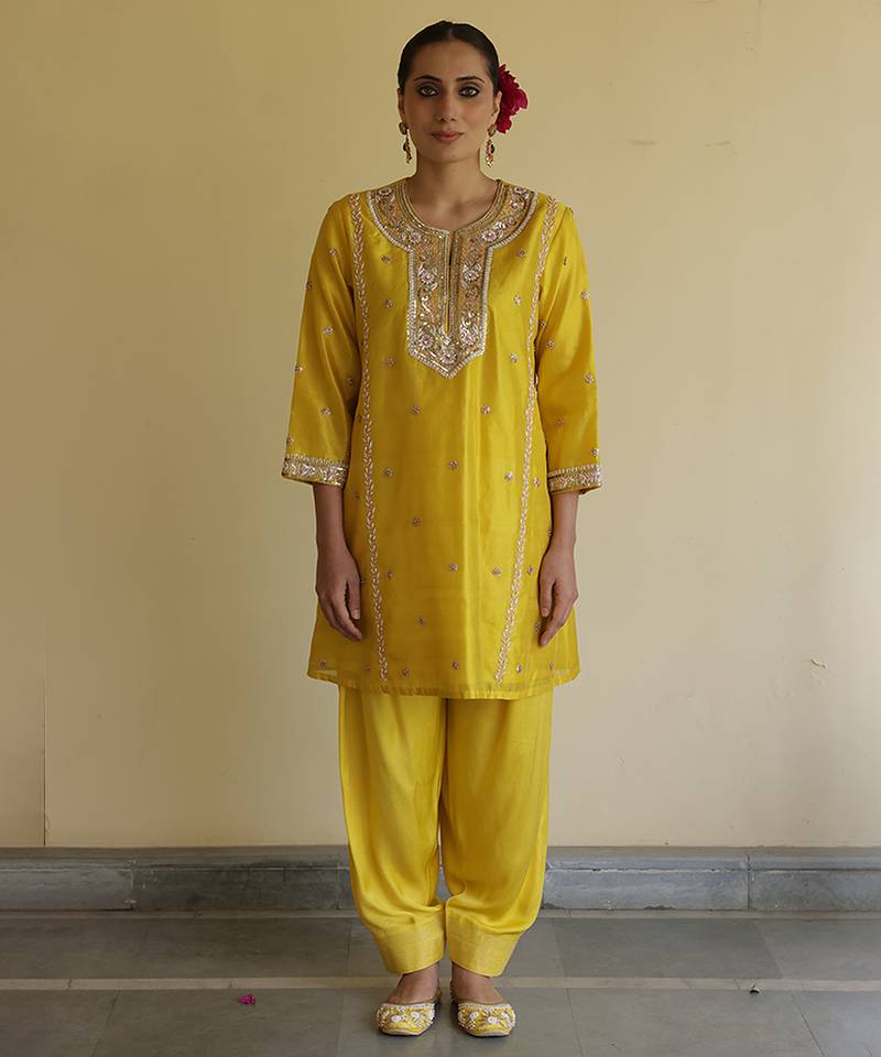 Yellow Embroidered Silk Kurta Set