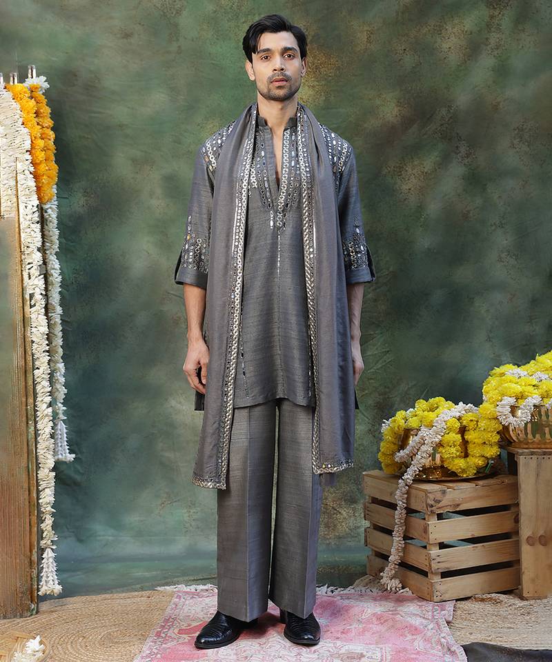 An Elegant Grey Silk Kurta Set Highlighted With Refined Embroidery For A Modern Yet Traditional Look. The Subtle Tone Combined With The Natural Sheen Of Silk Creates Understated Luxury, Making It Suitable For Festive Lunches, Office Celebrations, And Intimate Cultural Events With Timeless Appeal.