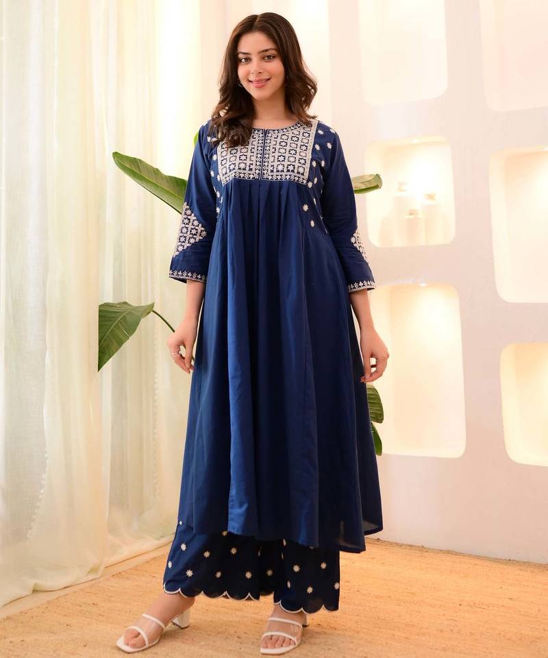 • Product Id : 4686855 • Package Details : 1 Kurta / 1 Pant / 1 Dupatta • Type : Kurta Sets • Region : Gujarat • Work : Embroidered • Type : Anarkali Suits • Look : Designer • Sleeve : Quarter Sleeve • Neck Style : Round Neck • Color : Blue • Fabric : Silk Blend • Stitching : Stitched • Length : 44.0 Payments [+]