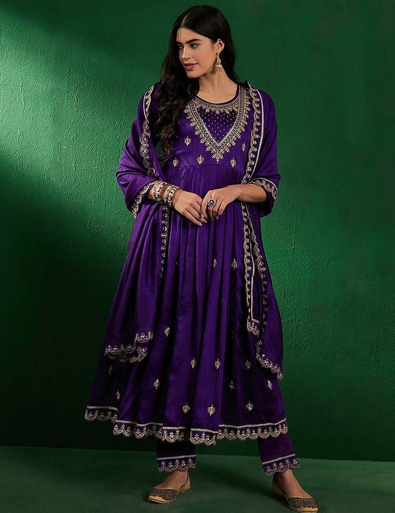 • Product Id : 4668316 • Package Details : 1 Kurti / 1 Pant / 1 Dupatta • Type : Kurta Sets • Region : Gujarat • Occasion : Ceremonial • Fabric : Silk • Work : Embroidered • Type : Anarkali Suits • Look : Fashion • Sleeve : Quarter Sleeve • Neck Style : V Neck • Color : Purple • Stitching : Stitched • Length : 44.0 Payments [+]