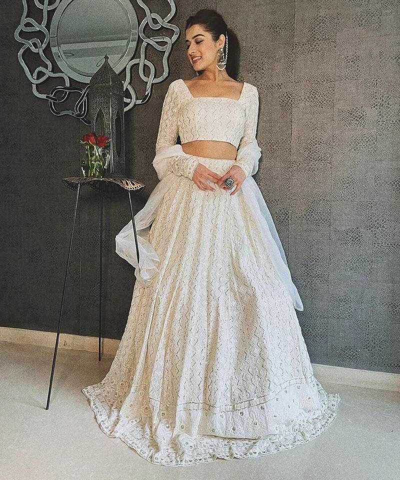 • Style : A Line Lehenga • Fabric : Georgette • Work : Embroidered • Color : White Dupatta Details