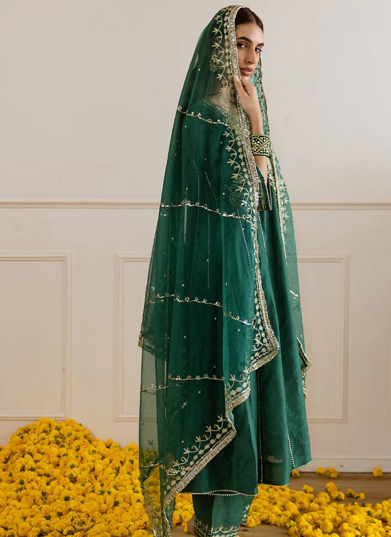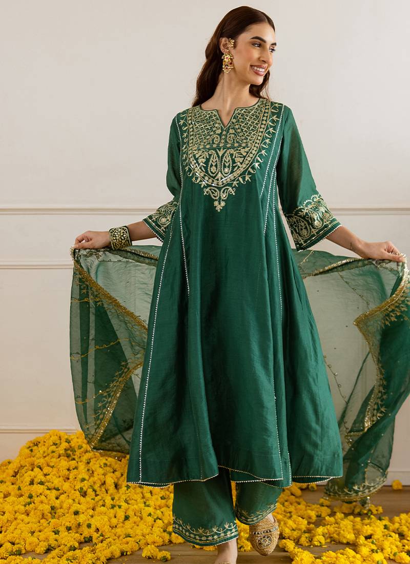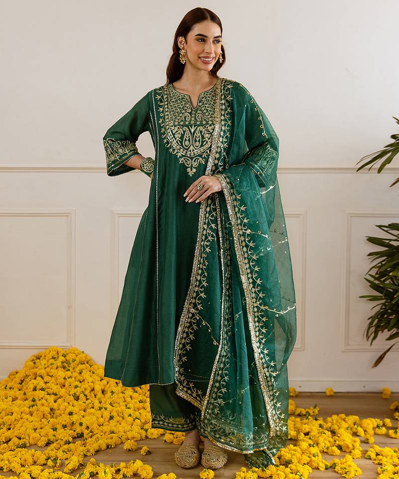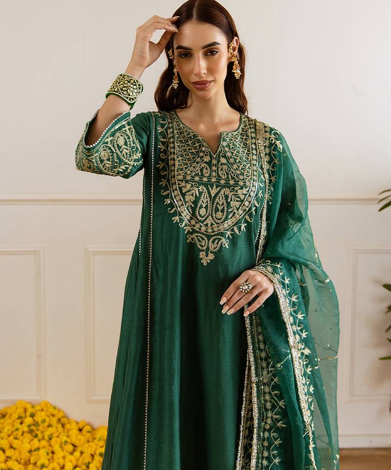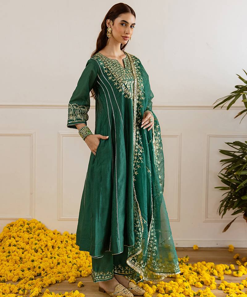 A Rich Emerald Three‑Kali Kurta In Feather‑Light Chanderi Showcases A Regal V‑Neck Yoke Densely Detailed With Hand‑Done Zari And Tārī, Creating Celebratory Shimmer Without Weight. Coordinated Straight Pants Keep The Fall Fluid, While The Sheer Organza Dupatta Edged In Zari Frames The Silhouette With Airy Structure And Ceremony‑Ready Polish.